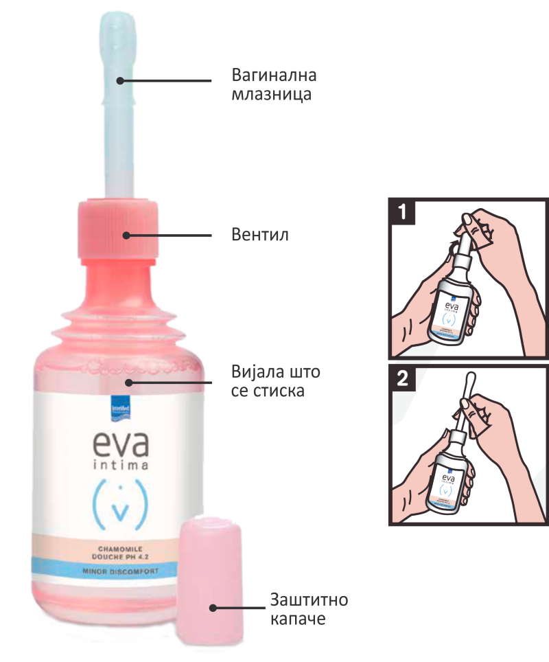 Ако вентилот не е отворен, турнете ја млазницата назад во вијалата и повторете ја постапката (слика 2). Вметнете ја млазницата во вагината и изведете го туширањето со постојано стискање на вијалата. ЗАБЕЛЕШКА: - Вагиналното туширање можете да го извршите седејќи во тоалетот или внатре во туш кабината (во стоечка или клекната положба). - Во случај да остане значителна количина од растворот за вагинално чистење во вијалата, извадете ја млазницата од вагината и повторете ја постапката на вагинално туширање со преостанатата количина раствор за вагинално чистење.