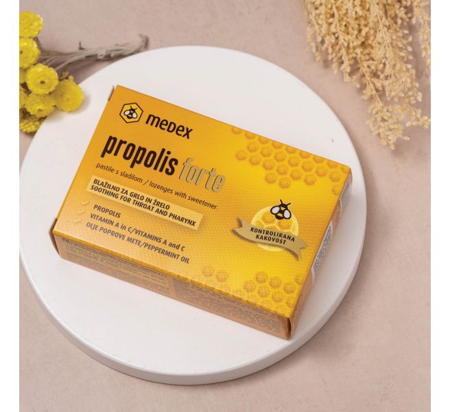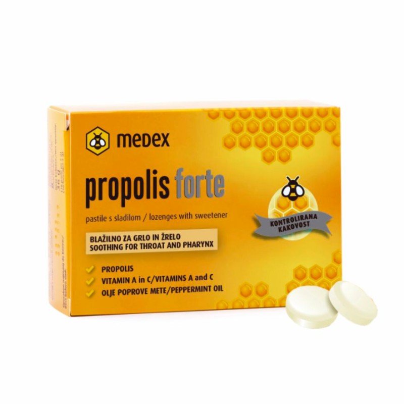 Пастилите од прополис ги ублажуваат проблемите во грлото и фаринксот. Прополис форте е дополнет со витамини А и Ц, кои придонесуваат за зајакнување на имунолошкиот систем. Витаминот А придонесува за одржување на здрави мукозни мембрани. Погодни и за деца и за возрасни.